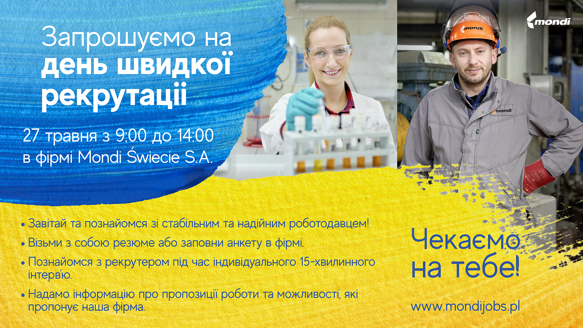 Powiatowy Urząd Pracy w Świeciu i Mondi Świecie S.A. zapraszają na Dzień Szybkiej Rekrutacji, który odbędzie się dnia 27.05.2022 r. w godzinach od 9:00 do 14:00 w siedzibie Mondi Świecie S.A., ul Bydgoska 1.